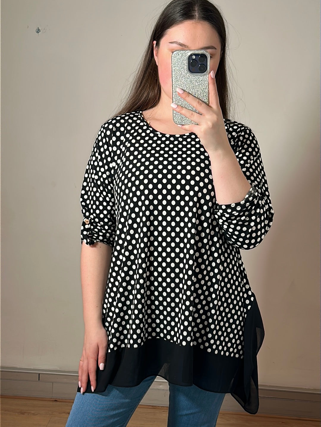 Modellen er 169 cm høj og bruger normalt en størrelse 38/40.