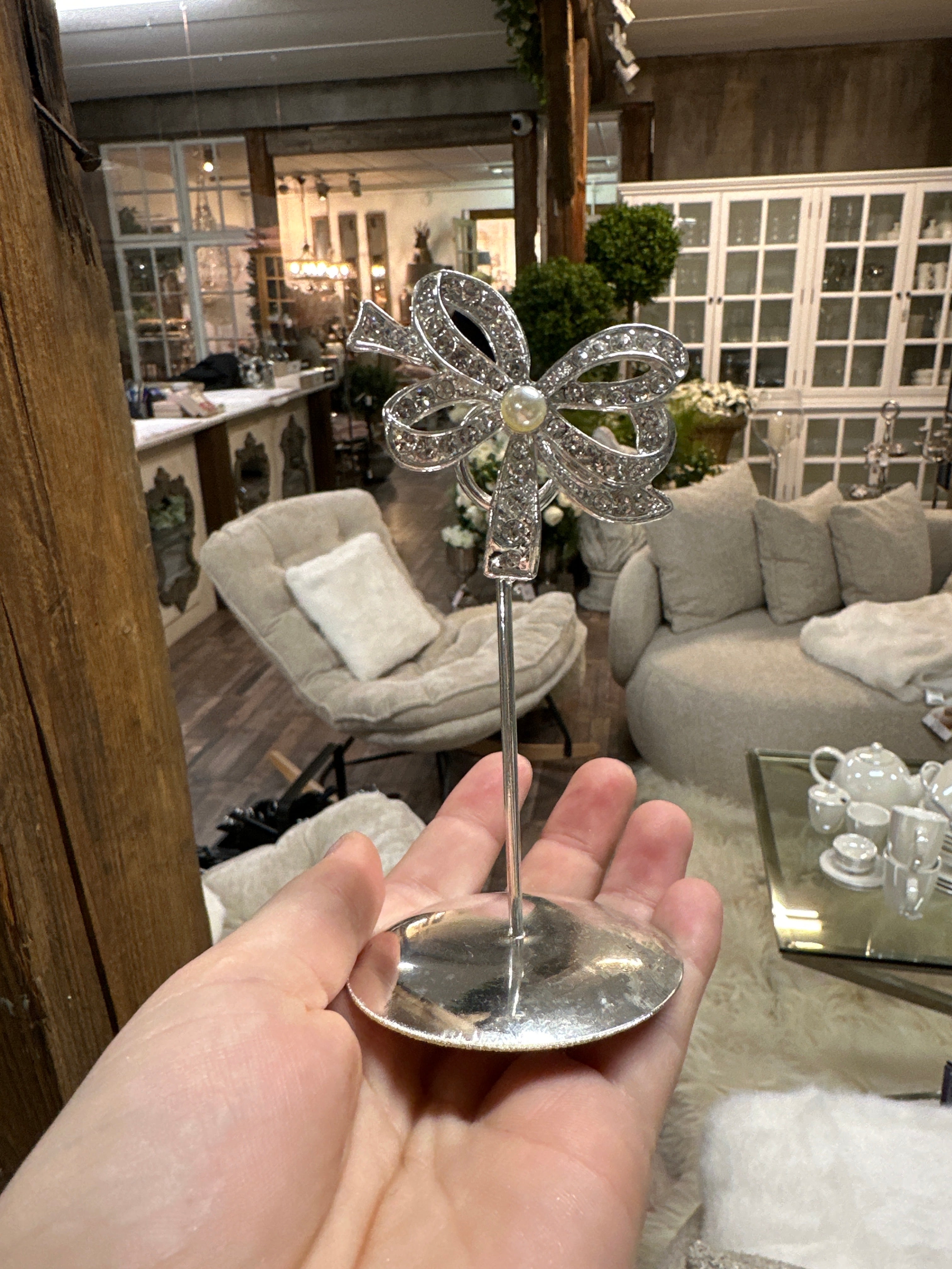 Gør din borddækning endnu mere stilfuld med denne smukke bordkortholder med sløjfe. Den dekorative sløjfe med glitrende detaljer og perle i midten giver et elegant og luksuriøst udtryk, perfekt til bryllupper, konfirmationer, fødselsdage eller andre festlige lejligheder.