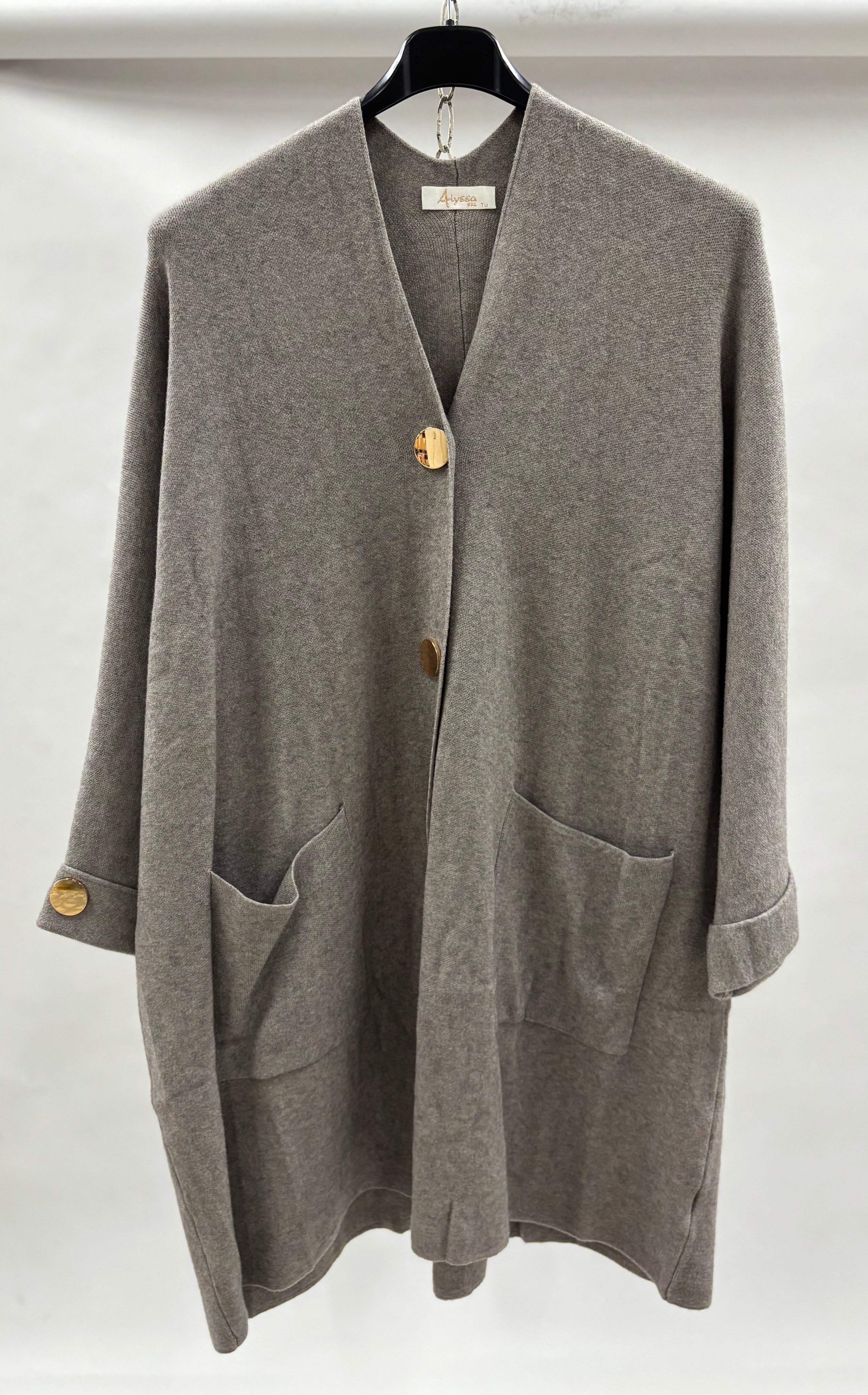 En stilfuld og blød cardigan med flotte guldknapper, der giver et elegant udtryk. Foran sidder praktiske striklommer, som fuldender det moderne og hyggelige look.