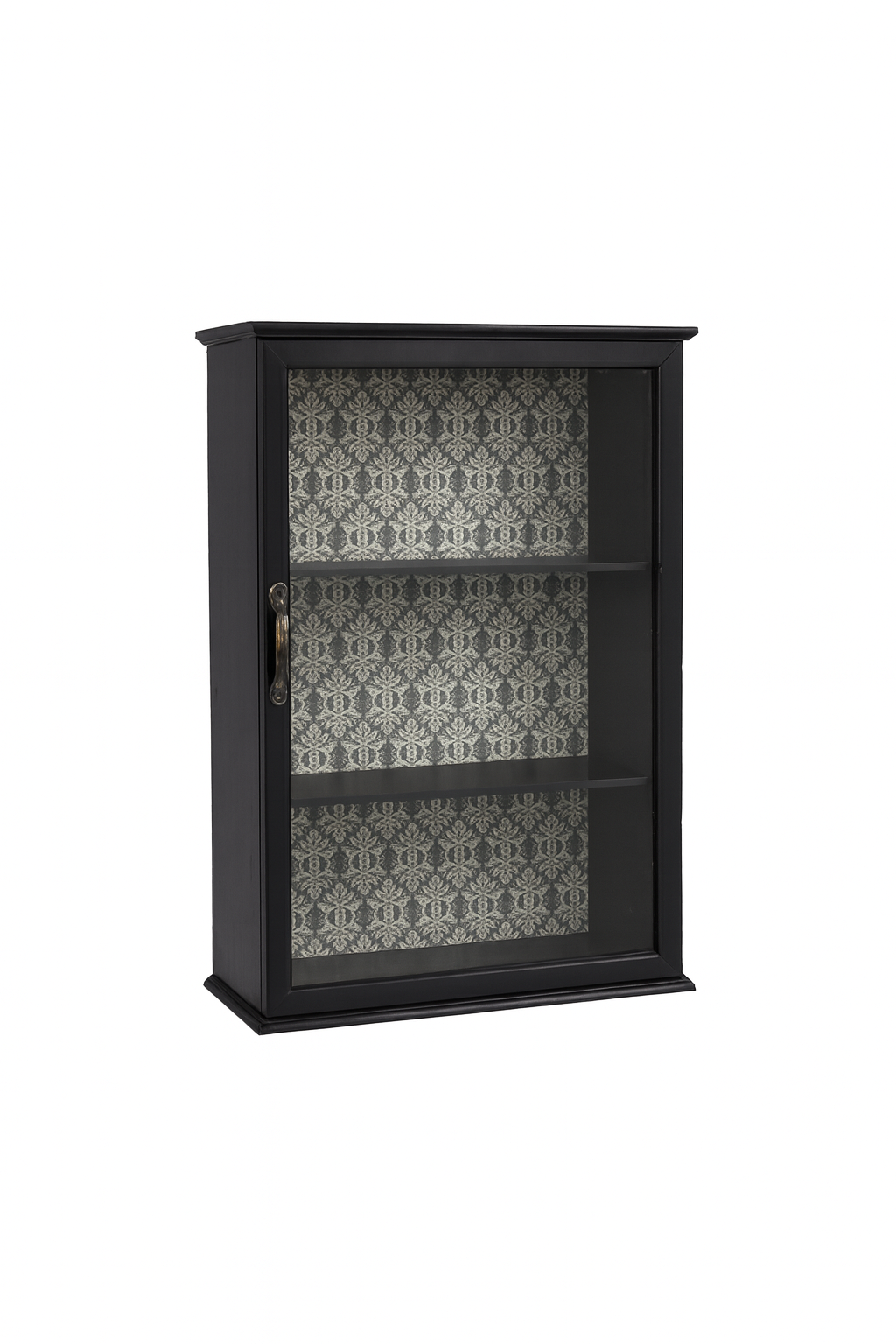 Tilføj et stilfuldt og praktisk opbevaringsmøbel til dit hjem med dette elegante hængeskab i sort. Skabet har glaslåge og to indvendige hylder, der giver dig mulighed for at udstille små dekorationer, glas, krydderier eller samlerobjekter på en smuk og overskuelig måde.