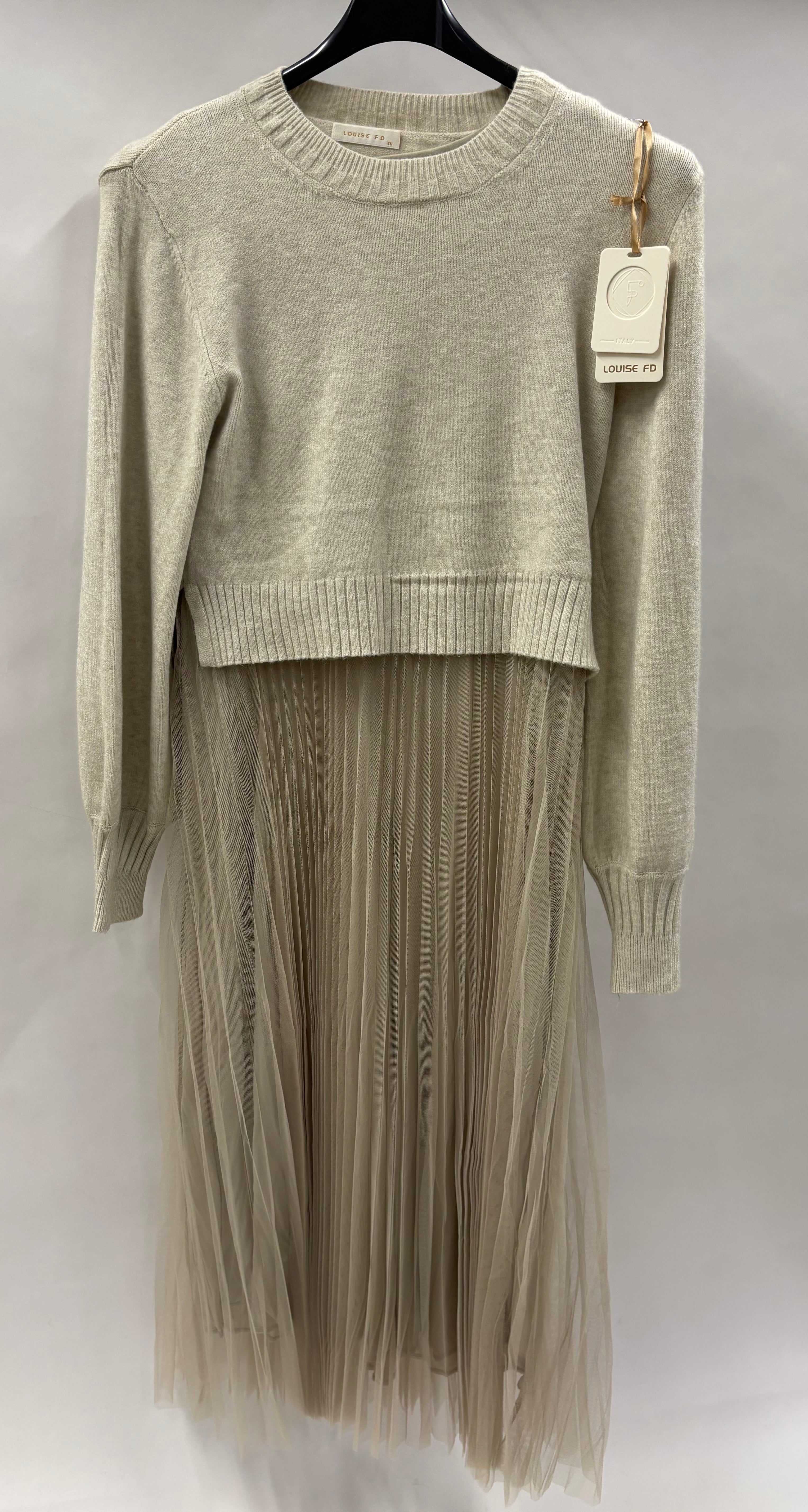 Skab et moderne og feminint look med denne elegante kjole med underdel i tyl og striktrøje udenpå. Den lette tyl giver nederdelen et luftigt og romantisk udtryk, der bevæger sig smukt, mens striktrøjen tilfører en hyggelig og stilfuld kontrast.