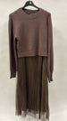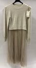 Kjole med tylunderdel og striktrøje udenpå Skab et moderne og feminint look med denne elegante kjole med underdel i tyl og striktrøje udenpå. Den lette tyl giver nederdelen et luftigt og romantisk udtryk, der bevæger sig smukt, mens striktrøjen tilfører en hyggelig og stilfuld kontrast. Kombinationen af det bløde strik og den fine tyl gør sættet perfekt til både hverdag og mere festlige lejligheder. De to dele kan bæres sammen for et harmonisk lag-på-lag look eller bruges hver for sig for ekstra fleksibilitet i din garderobe. Brystmål: 120 cm Fordele Elegant kjole med let og feminin tylunderdel Blød striktrøje udenpå...