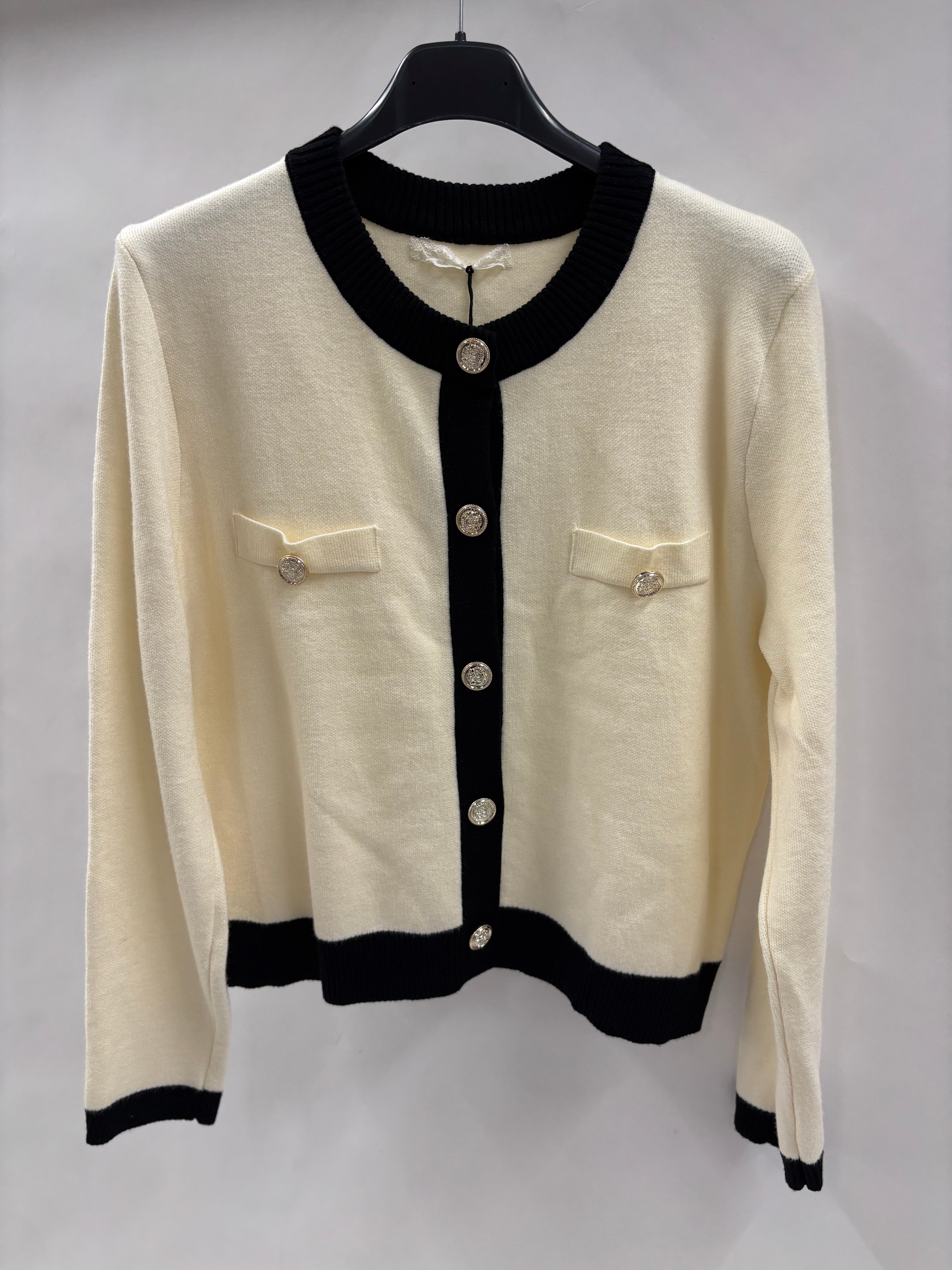 Opgrader din garderobe med denne korte strikjakke/cardigan, der kombinerer tidløst design med moderne kontrastdetaljer. Den bløde strikkvalitet sikrer komfort hele dagen, mens kontrastfarverne tilføjer et elegant og iøjnefaldende touch. Cardiganen er perfekt til layering over bluser, toppe eller kjoler, når du ønsker både varme og stil.