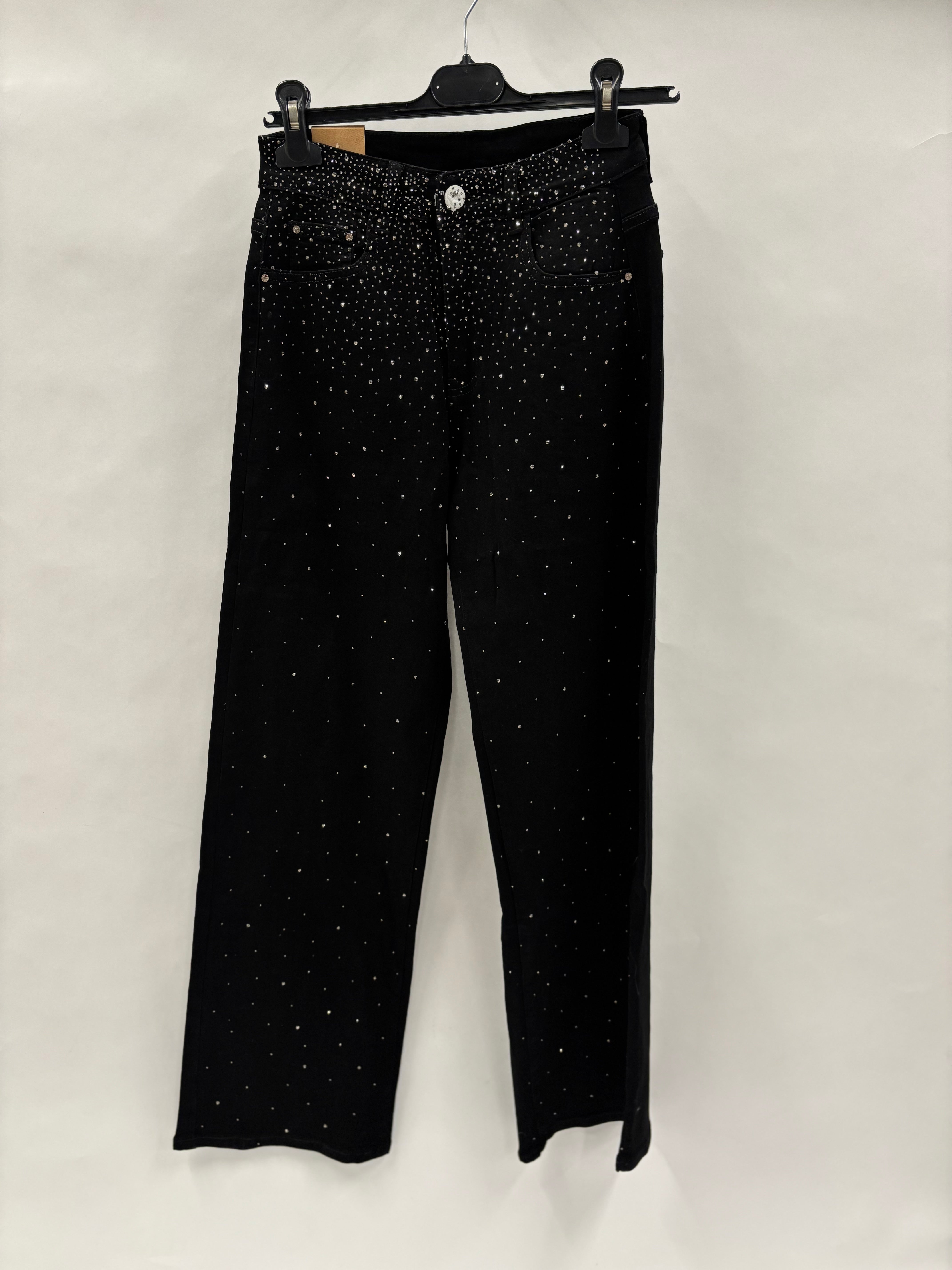 Opgrader din denimstil med disse sorte bukser i cowboystof, der kombinerer det klassiske jeansudtryk med eksklusive, funklende detaljer. De dekorative sten ved taljen og ned langs benene giver bukserne et luksuriøst og iøjnefaldende look, som skiller sig ud uden at blive for meget.