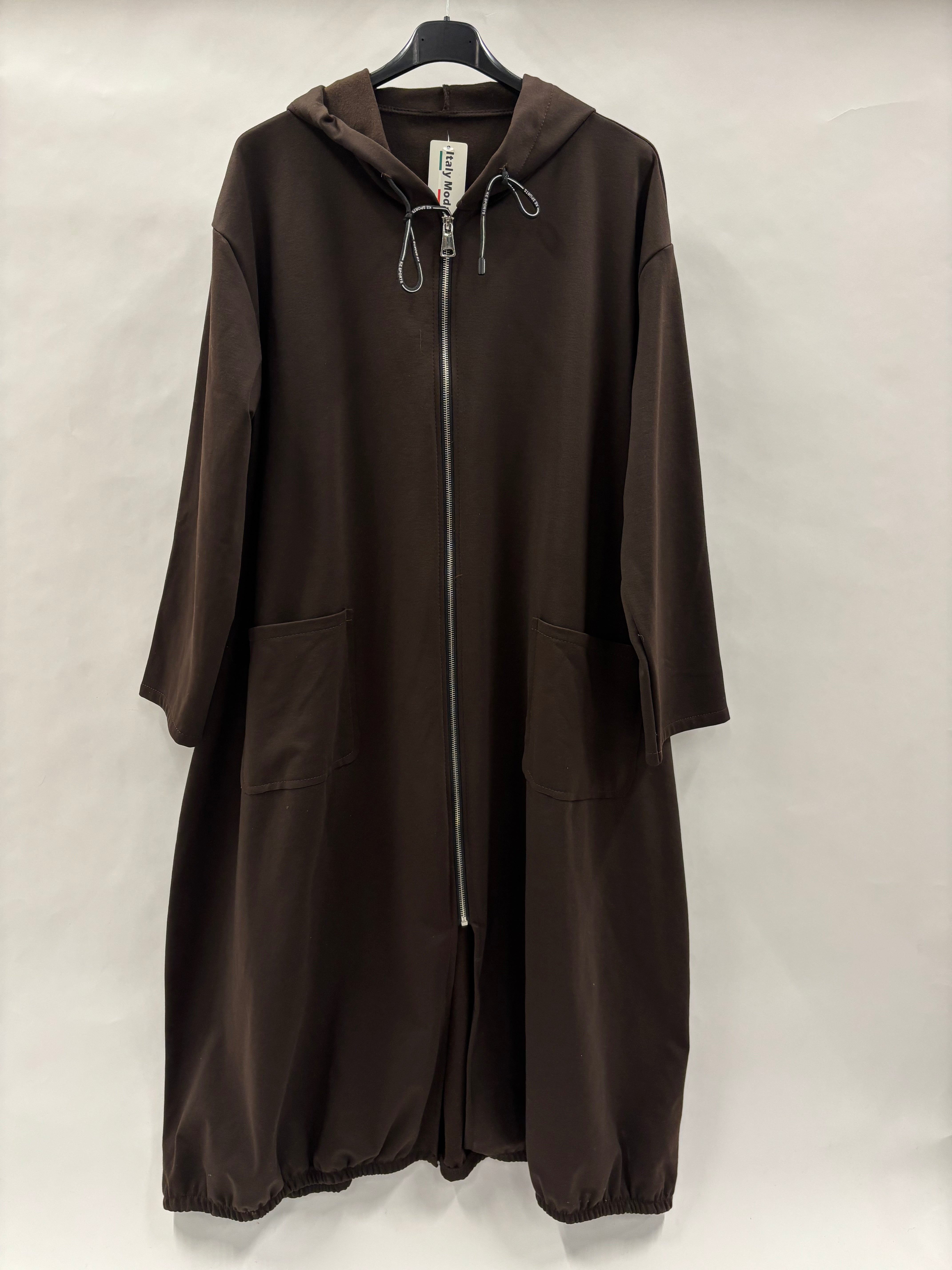 Behagelig lang sweatshirtkjole i blødt materiale, perfekt til både afslapning og hverdagsbrug. Kjolen har lynlås ned gennem, som gør den nem at åbne og lukke, samt en praktisk hætte, der giver et afslappet og moderne look.